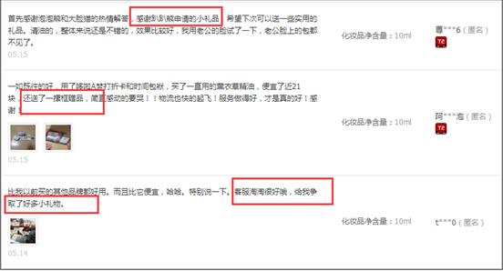 你几乎可以在阿芙店铺里面80%以上的评论里面看到这样的描述:送了很多小赠品、有好多小礼品、非常感谢客服妹妹申请了那么多的小赠品……