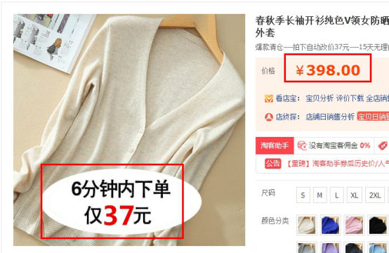 第一个例子,售价398,但是主图文案写:6分钟内下单仅37元,你有想单价的冲动吗?写上了这句话,传达给买家的就是我现在在大促,你现在6分钟内下单就可以花37元拿走398元的针织衫。抓住了买家喜欢贪便宜的心理,而且主题明确。我的目的就是要买家点击并且下单。你需要去想的是你的目标客户需要什么,他们需要的是占便宜。这个案例大家可以借鉴。