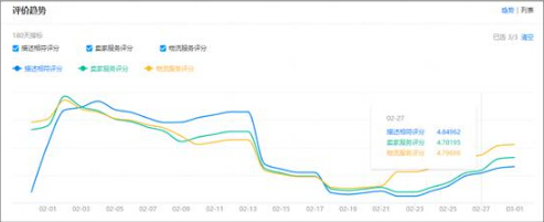 在“生意参谋——经营分析——服务质量——评价概况”这个路径里面,你可以看到自己的DSR评分的近一个月的走势。